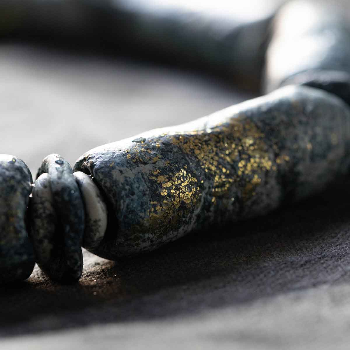 Necklace with Sculpted Blue Beads and Gold Leaf.