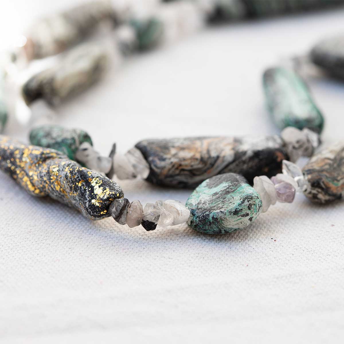 30″ Length. This is a beautiful piece. Large beads are hand sculpted. Lightweight and comfortable to wear.